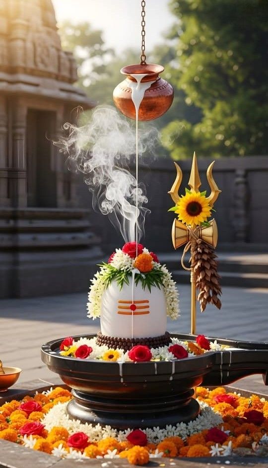 The Shiva Lingam is bathed with Panchamrit and holy water, symbolizing purification and devotion.