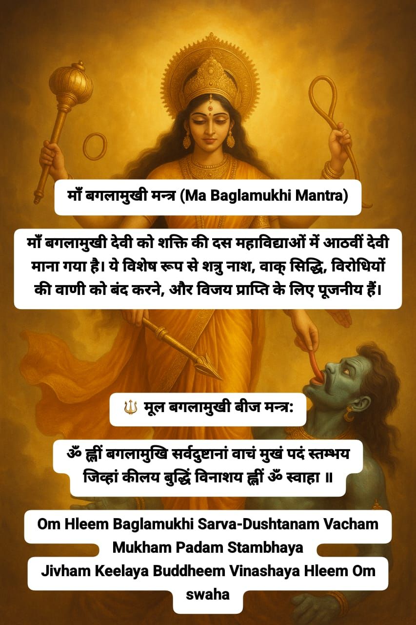 Yellow clothing, turmeric, curd, and yellow flowers hold special importance in the worship of Maa Baglamukhi. During the worship, the mantra “Om Hleem Baglamukhi Namah” is chanted, which provides energy to devotees and guides them during difficult times. The worship is especially fruitful on Tuesdays, Thursdays, and during Navratri.
