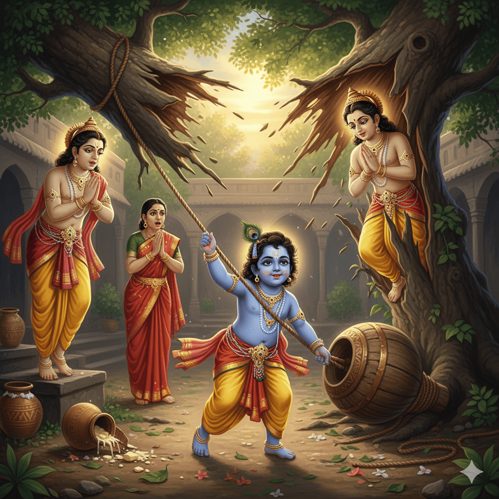 One day, lord krishna's mother tied him to a heavy wooden mortar as punishment for stealing butter. But krishna divided it between two trees. And miraculously, the tree fell down.