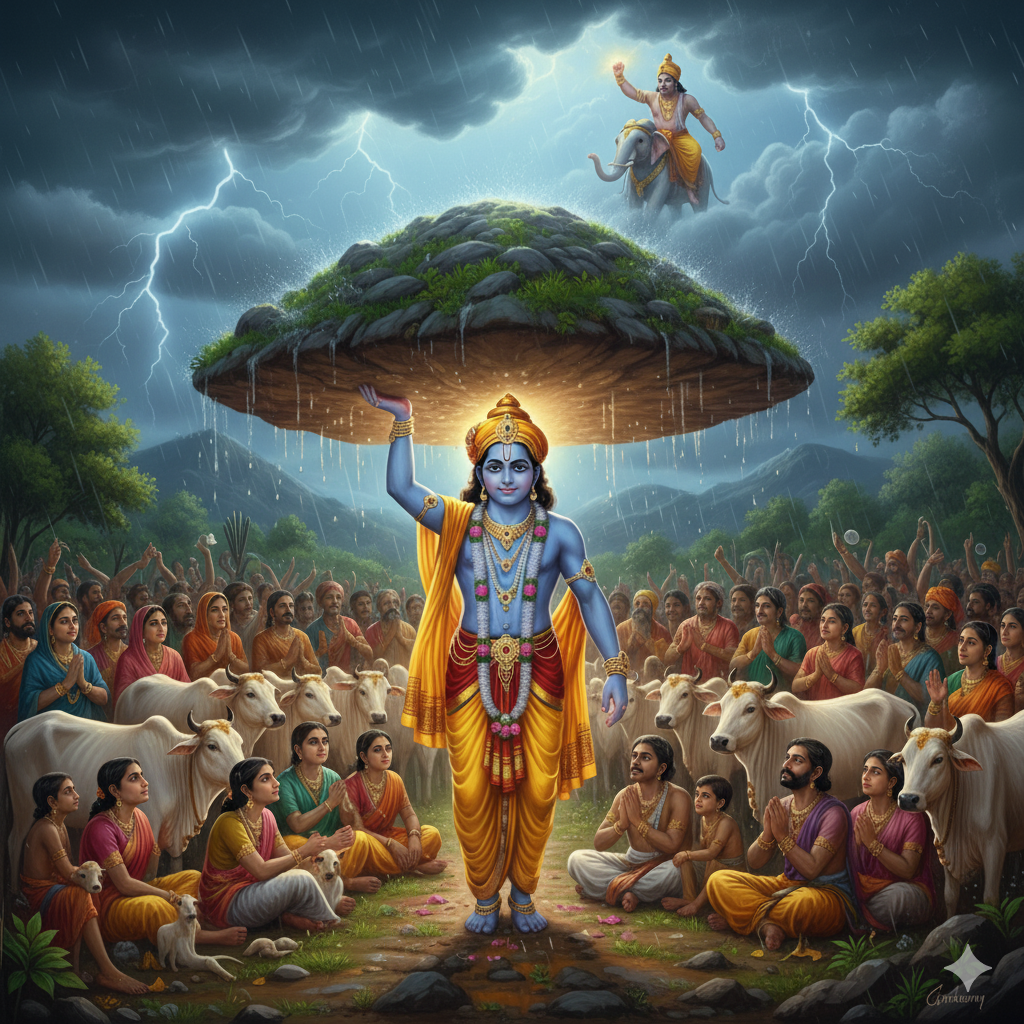 when the people of Vrindavan prepared to worship to lord Indra for rain , so lord krishna advised him to worship to goverdhan hill insted because it nourish our cow and land. Angry Indra sent heavy rain but krishna lift goverdhan hill on a little finger.