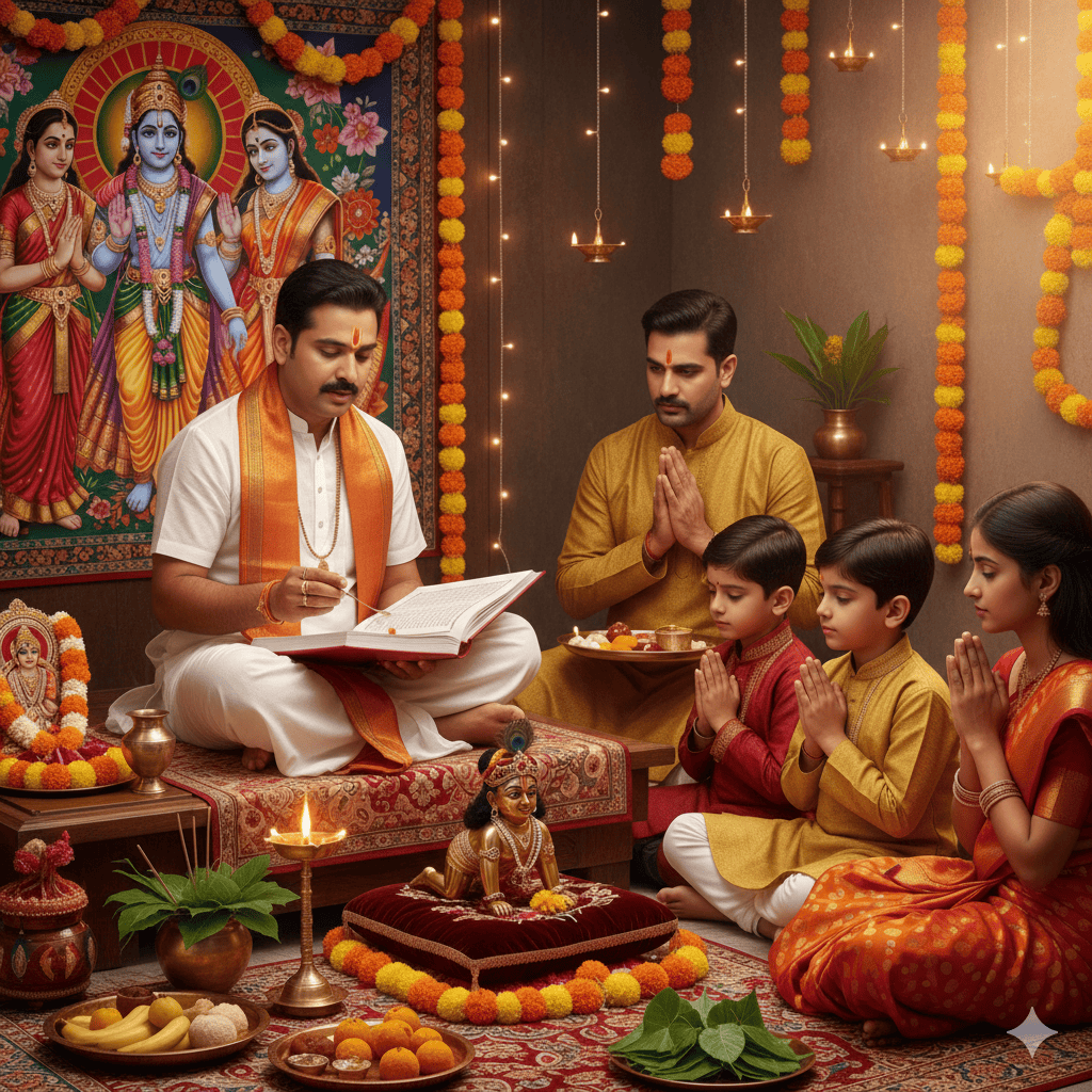 Our Pandit Ji performs Ganesha Puja, Kalash Sthapana, Lord Krishna Abhishekam, Bhajans, Aarti, and Prasad distribution.