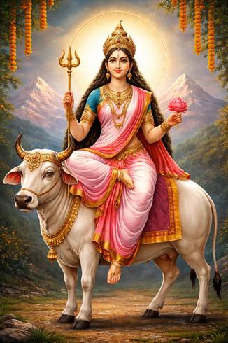 Maa ShailPutri -The first day of Navratri is considered a symbol of strength and stabilitysubsequently,mother sati was born into the household of the himalayas and came to be known as shailputri;in the form ,she undertook rigorous penance once again to attain lord shiva as her husband.